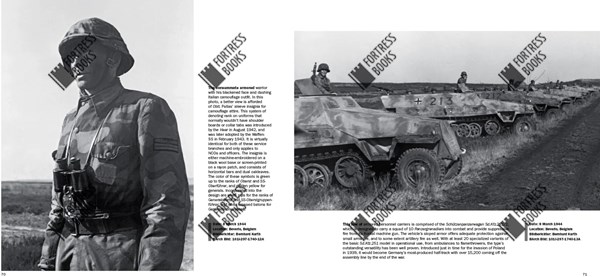 Het boek staat vol met opvallende afbeeldingen van halfrupsvoertuigen en trekkers, zoals respectievelijk de Schützenpanzerwagen Sd.Kfz.251 en Zugkraftwagen 8t Sd.Kfz.7, evenals de robuuste Panzerkampfwagen IV middelzware tank. Er is ook een overvloed aan camouflagekleding te zien, met het volledige assortiment Waffen-SS-bladpatronen op helmhoezen en smocks, plus het kenmerkende Italiaanse M29-camouflagemateriaal dat werd gebruikt voor verschillende kledingstukken, zoals broeken en overall. De grote voorraad machinegeweren waar 12.SS-Pz.Div. trots op was, is duidelijk te zien op deze foto's, met de formidabele MG-42 die overal in deze gedetailleerde kroniek van de ontwikkeling van de formatie voorkomt.